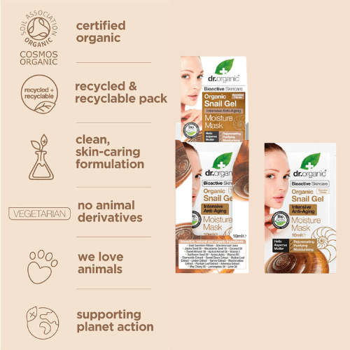 Dr.Organic Snail Gel Maschera Viso Idratante contiene l’eccezionale bava di lumaca, una sostanza prodotta naturalmente dalla lumaca per riparare i suoi tessuti ed il suo guscio quando danneggiati, in combinazione con una miscela esclusiva di estratti ed oli naturali e bioattivi.